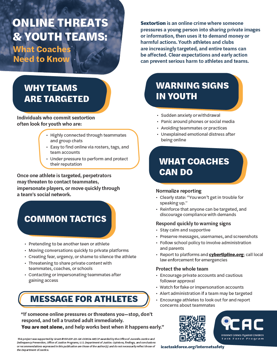 Sextortion is an online crime where someone pressures a young person into sharing private images or information, then uses it to demand money or harmful actions. Youth athletes and clubs are increasingly targeted, and entire teams can be affected. Clear expectations and early action can prevent serious harm to athletes and teams.