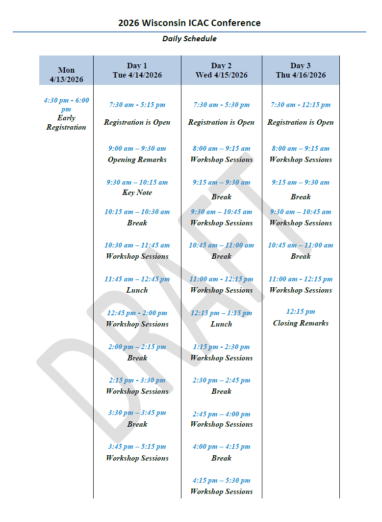 Draft schedule for the 2026 Wisconsin ICAC Conference